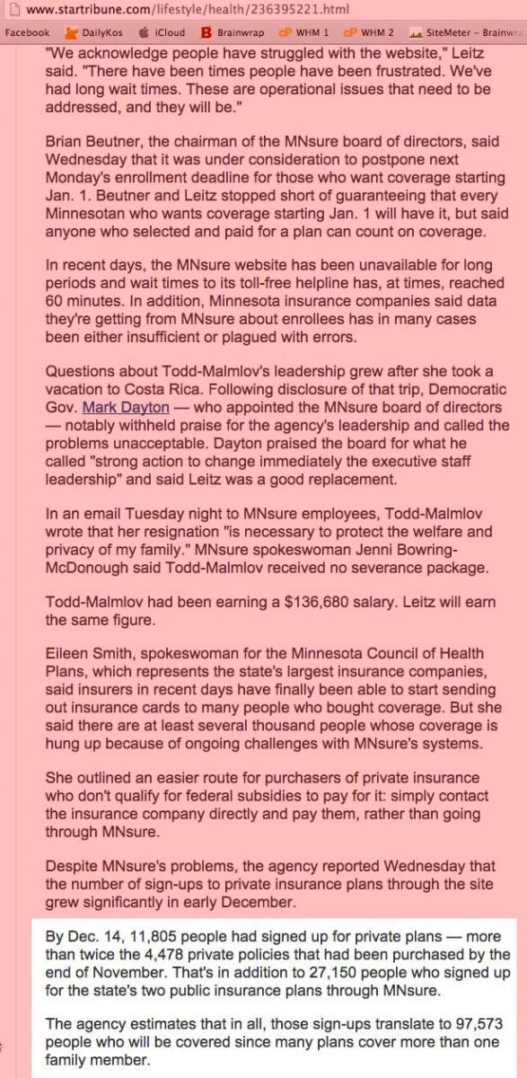 However, when I checked the "MNsure grids for late crush" article this morning, both the "125K people" and "3,900 unpaid" paragraphs are missing (instead, there's a new (I think) paragraph stating the exchange's hoped-for goals of 70,000 private & 135,000 total enrollments). (I should also note that 12,051 + 12,708 + 19,420 only adds up to 44, 179, not 53,000, so I'm not sure what that's about.)