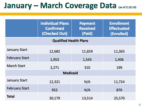 For another, let's take a look at the claim about Minnesota in the second quote above. This comes from a "Conservative Intelligence Briefing" which claims that "only 14,500 have paid/had payments pending" as of January 18 out of 27,775 enrollments in the state. They got this from the Jan. 22nd MNsure Dashboard presentation which included detailed info on the state of Minnesota's state exchange at the time. Sure enough, enrollment was 27,775 as of 01/18, and yes, there's a record on Page 14 of the report about payments. HOWEVER, they completely misunderstood this: That's 14,522 transactions, not 14,522 people paid for. A transaction covers a policy, which generally includes more than one person (ie, a family of 3 would only have one payment transaction, not 3). Take Minnesota out of the equation.