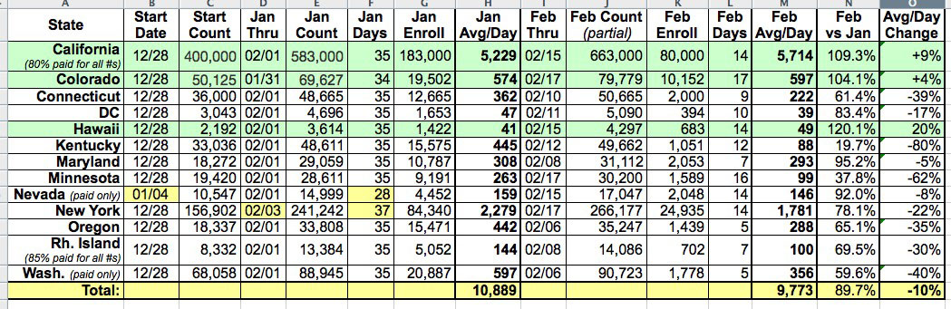 One more very small update today. This isn't an official data release, but this press release from yesterday mentions the total enrollment in Minnesota as being "nearly 95,000". This presumably includes enrollments through 2/17.