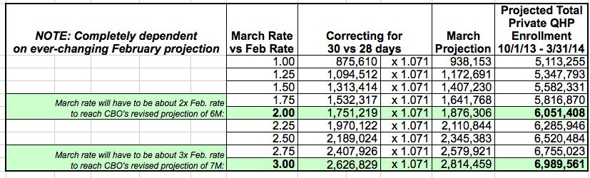 As you can see, it's looking like a pretty straightforward projection. If March roughly equals February's rate, enrollments will break 5 million. If March doubles the February rate, they'll hit 6 million (the CBO's revised projection); and if March is truly a blowout month and it triple's February's rate, there's even the outside chance that ACA enrollments will still manage to hit the original 7 million figure that the CBO originally projected.