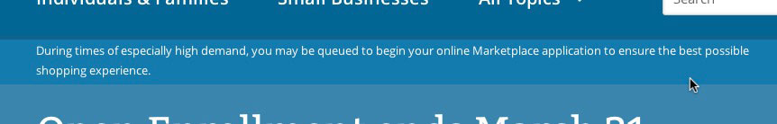 In addition, if you visit Healthcare.gov today, you're presented with the following add-on message: "During times of especially high demand, you may be queued to begin your online Marketplace application to ensure the best possible shopping experience."