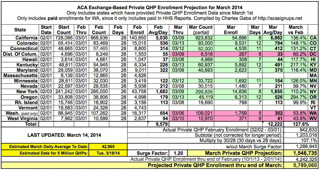 While neither of the above give any hard (or even soft) numbers, it certainly sounds like The Surge has begun. As such, I'm moving my "March Surge Factor" addition to the projection table up from Monday to today. I'm starting with an assumption of a 20% gain in the 2nd half of the month over the 1st half, which would make March QHPs around 1.55 million for a grand total of 5.79 million.