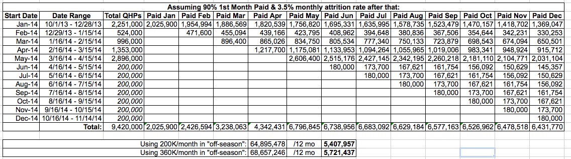 So, credit is due to Mr. Conover: If you specifically use the average of the monthly paid QHPs over the full 12-month period of 2014, and if you use this as the specific "expectation" number that you're defining as the only one which counts as a valid one to compare against, and if the 1st month payment rate is 90%, and if the monthly attrition rate is 3.5% each and every month as Mr. Conover claims, then Mazel Tov! A cookie for Mr. Conover! Hell, my chart above even goes beyond Conover's math at the low end (he noted that the "rosiest" scenario still comes up 4% short).