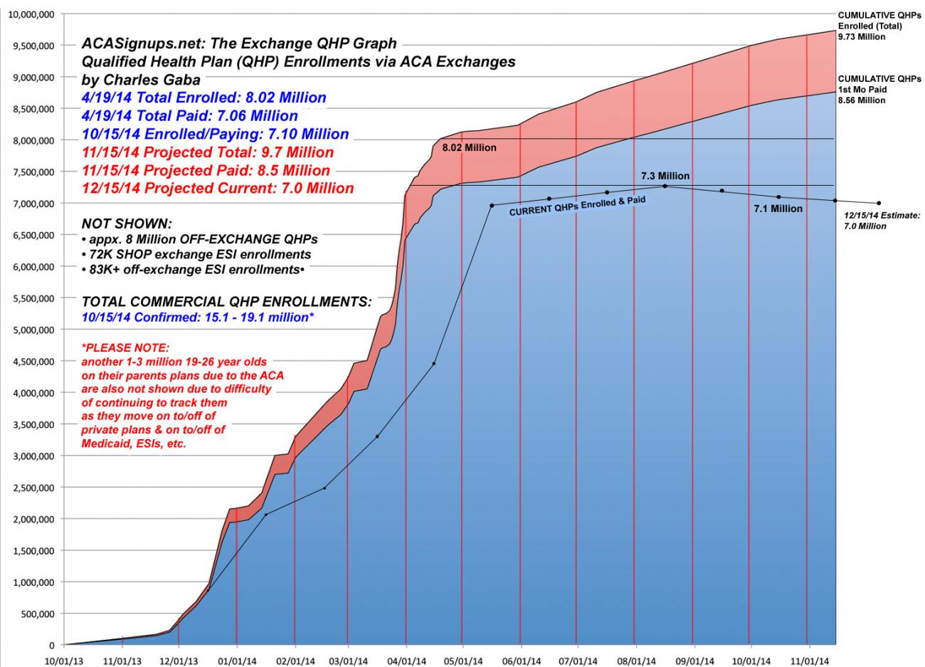 The bottom line is that in the end, 2014 QHP enrollments will end the year at almost precisely the same 7 million people that the CBO projected in the first place (and which the media, pundits, etc...including myself...all obsessed over to no end last spring).