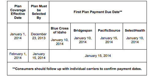 ...In order to give Idahoans extra time to make their first premium payments, all four of the health insurance companies that are selling individual and family plans on Your Health Idaho, Blue Cross of Idaho, BridgeSpan, PacificSource and Select Health have announced that they will voluntarily extend the payment deadline for January premiums. This means that Idahoans who enroll in a Your Health Idaho plan by December 23 for coverage on January 1 will now have an extended deadline to make their first premium payment (see below for payment deadlines).