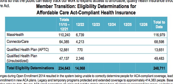 Today is the final day for Massachusetts residents to enroll in a private healthcare plan if they want coverage to start on January 1st. As of last night, they had a total of 248,711 eligibility determinations, of which 131,732 are for private QHP policies (the other 117K have already been enrolled in Medicaid, aka "MassHealth", which is impressive in and of itself).