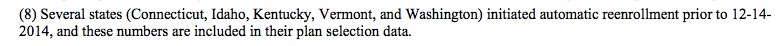 - Colorado: When I saw the whopping 108K figure reported from Connect for Health Colorado through 12/15, I naturally assumed that this included both manual & autorenewals. There is a reference to several other states having autorenewals included in the 12/15 HHS report, but Colorado isn't among them, so I'm not sure what the deal is here. Still, the difference is so massive that it's pretty obvious that CO's 108K figure does indeed include autorenewals, so I'll assume that they just decided to throw them into their own report but not HHS's.