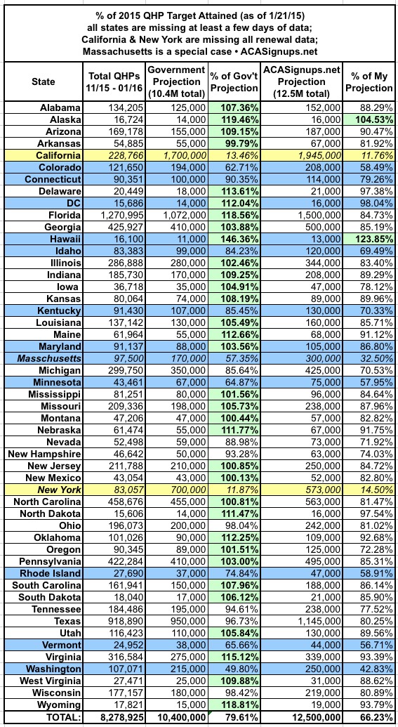 - At least 33 states have now reached the "official" 2015 QHP enrollment target laid out for them by either the HHS Dept (10.4 million nationally) or, in some cases, individual state governments/exchanges. Again, this means roughly 30% more enrollees than the April 19, 2014 total, but in some cases it's higher or lower (for instance, Florida only targeted enrolling about 9% more people this year than last, while New York is hoping to nearly double their 2014 total...and Massachusetts is a whole different game).