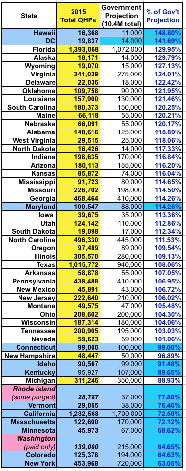 2015 QHP Selections vs. HHS/State Exchange Targets: HI & DC are again at the top. Beyond that, it's pretty much the same story. Florida is kicking butt, but they also set a fairly low bar for themselves anyway (only 9% higher than last year). At the opposite end of the spectrubm, New York is actually bringing up the rear here because they set their target way too high (a 94% increase!). |