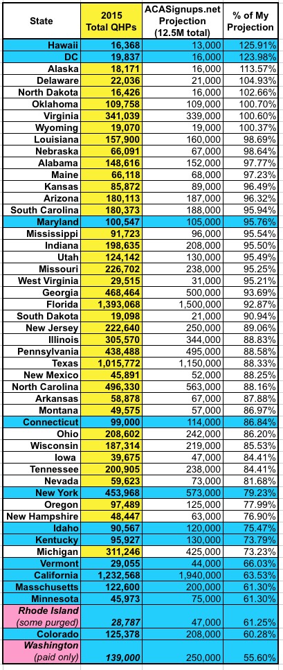 2) For Massachusetts, I've dropped my personal target from 300K to 200K. Yes, it's lame to change my "predictions" so close to the finish, but in MA's case I completely botched my methodology in the first place; I thought they had a lot more people in their special "temporary coverage" who were eligible for QHPs than actually were. It would be a bit unfair to rank them at the bottom for failing to meet a completely unrealistic goal.