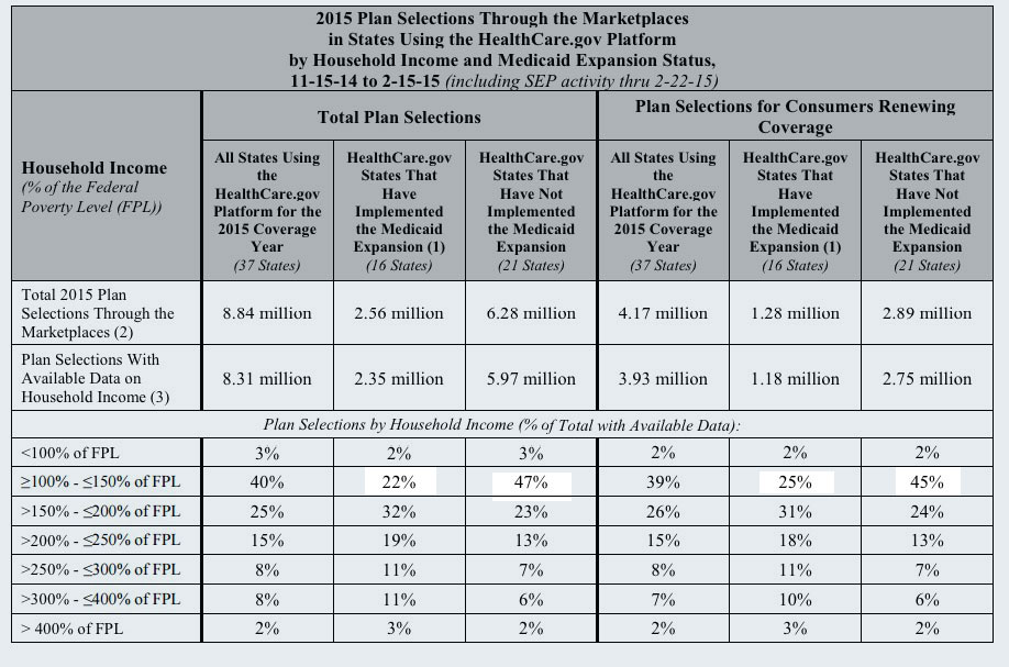 • As Andrew Sprung noted, check out the discrepancy between the income levels of those who enrolled in private policies via HC.gov in Medicaid expansion states vs. NON-expansion states: