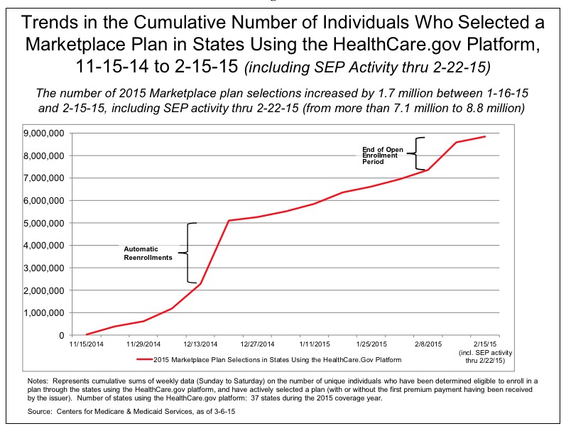 • More than 8.84 million people selected or were automatically reenrolled in 2015 plans through the Marketplaces in the 37 states that are using the HealthCare.gov platform. This includes: