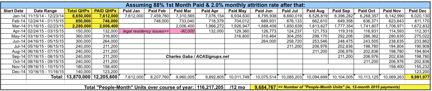 Assuming that off-season "life change" enrollments are roughly cancelled out by normal attrition throughout the rest of the year, the effectuated number should bobble right around the 10.0 - 10.1 million range for most of 2015, possibly dropping a bit below the 10M mark towards the tail end of the year (click for full-size version):