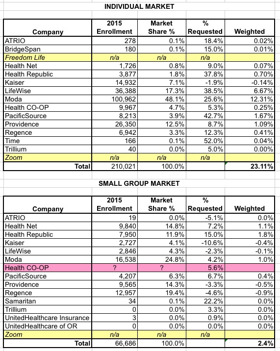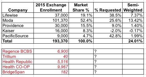 Hayes goes on to list the rough or exact enrollment numbers for all 10 companies, allowing me to whip up the following table, which gives a rough idea of the weighted average rate increases requested by the Oregon insurers: