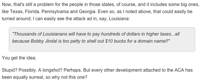 Yup. Can't argue with that here. In fact, I specifically used Bobby Jindal in one of my first entries on King v. Burwell (actually "Halbig" v. Burwell at the time) back in July, although at the time I was thinking of my "Denny's Grand Slam" solution: