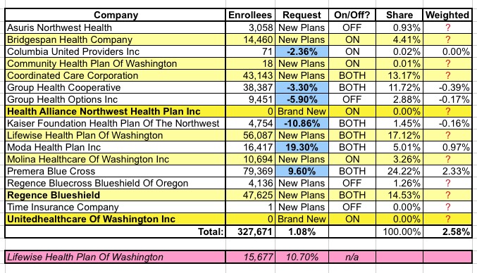 For instance, look at Lifewise Health Plan. They're on the exchange this year, and have over 56,000 ACA-compliant enrollees total. That's over 17% of the total market, so any significant rate increase (or decrease) from Lifewise would move the state-wide needle significantly.