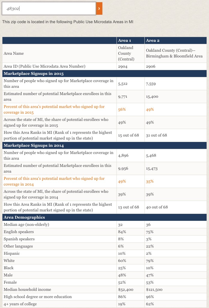 For instance, here's how it breaks out for my own zip code. I'm not entirely sure I understand the "Area 1 / Area 2" distinction, but it looks like 48302 spreads across 2 different "Public Use Microdata Areas" so they've listed both. In any event, either 49% or 56% of the potential ACA exchange enrollees have done so this year.