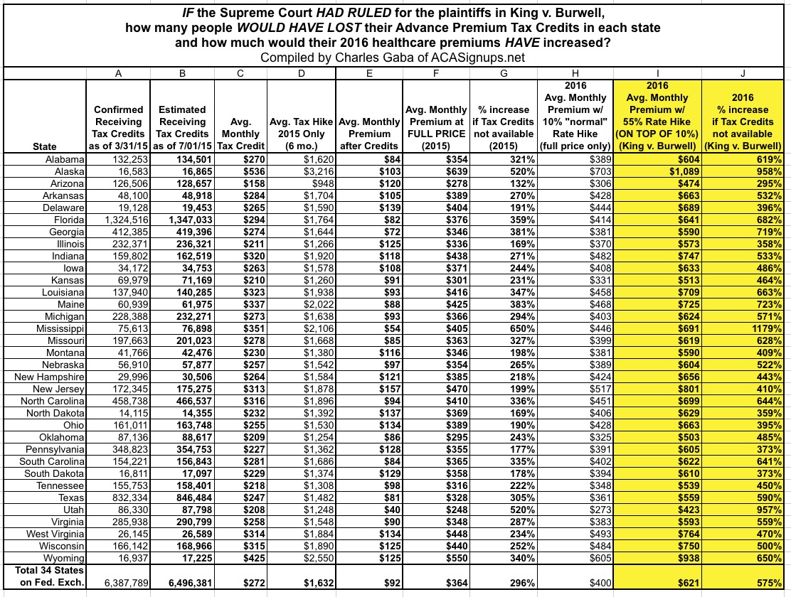 If the Supreme Court had done the Republican Party's bidding, had ruled for the plaintiffs and had cut off federal tax credits to those 34 states, millions of people would be looking at not "just" a 35% rate hike; not a 50% hike as I had previously thought; not even a 55% hike as I thought last night...
