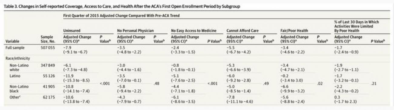 JAMA (Journal of the American Medical Association) just reported a study regarding the impact of the ACA on insurance coverage, access to care and health. Not much for me to add here; most of it has been widely reported by many outlets, including myself, but it's always good to have more supporting evidence of results, especially given the massive sample size (over half a million people!). I've reformatted & cleaned up the quoted section below for clarity, and you'd have to log into a JAMA account for the full report, but this gives the general skinny: