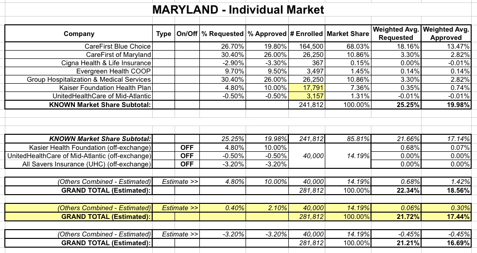 Today, the Maryland Dept. of Insurance has released the final, approved rate changes, and while 5 of the 8 companies on the individual exchange saw reductions in their rate change (2 others were approved as is, and one, Kaiser Health Plan was actually increased from 4.8% to 10%), it's still difficult to lock down a fully weighted average due to some crucial enrollment data missing.