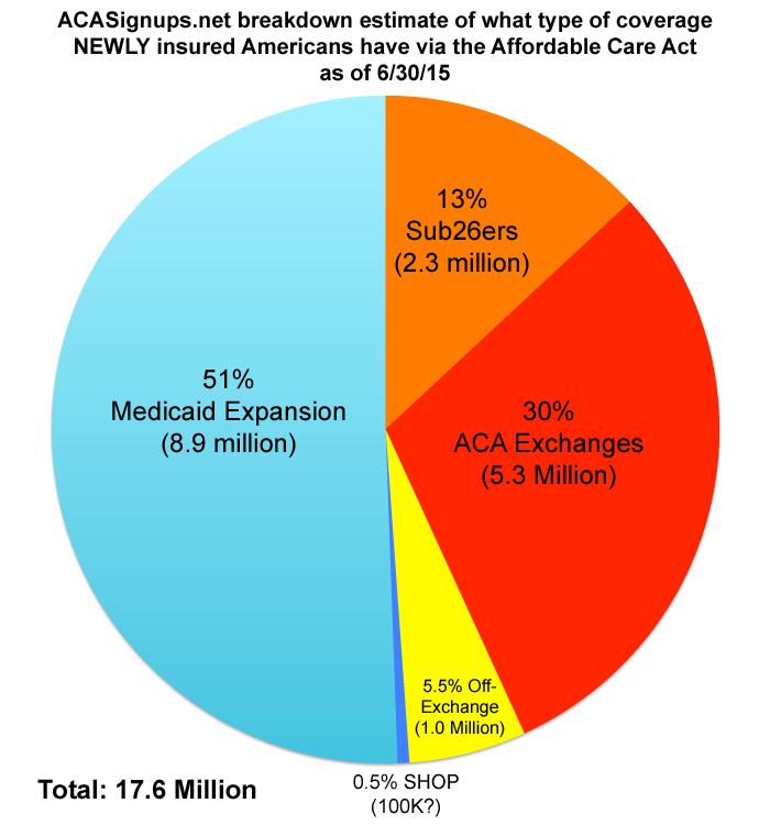 • The June CMS Medicaid report specifies that total Medicaid enrollment had increased by 13.1 million people since October 2013 as of the end of June 2015...but not all of these peole are newly-insured, and a portion of them are "woodworkers" (ie, it's debatable whether they should "count" as being added to Medicaid "due to" the ACA since they were technically already eligible). My best estimate of the total number of new Medicaid enrollees who are eligible strictly due to the ACA expansion provisions is around 9.9 milllion.