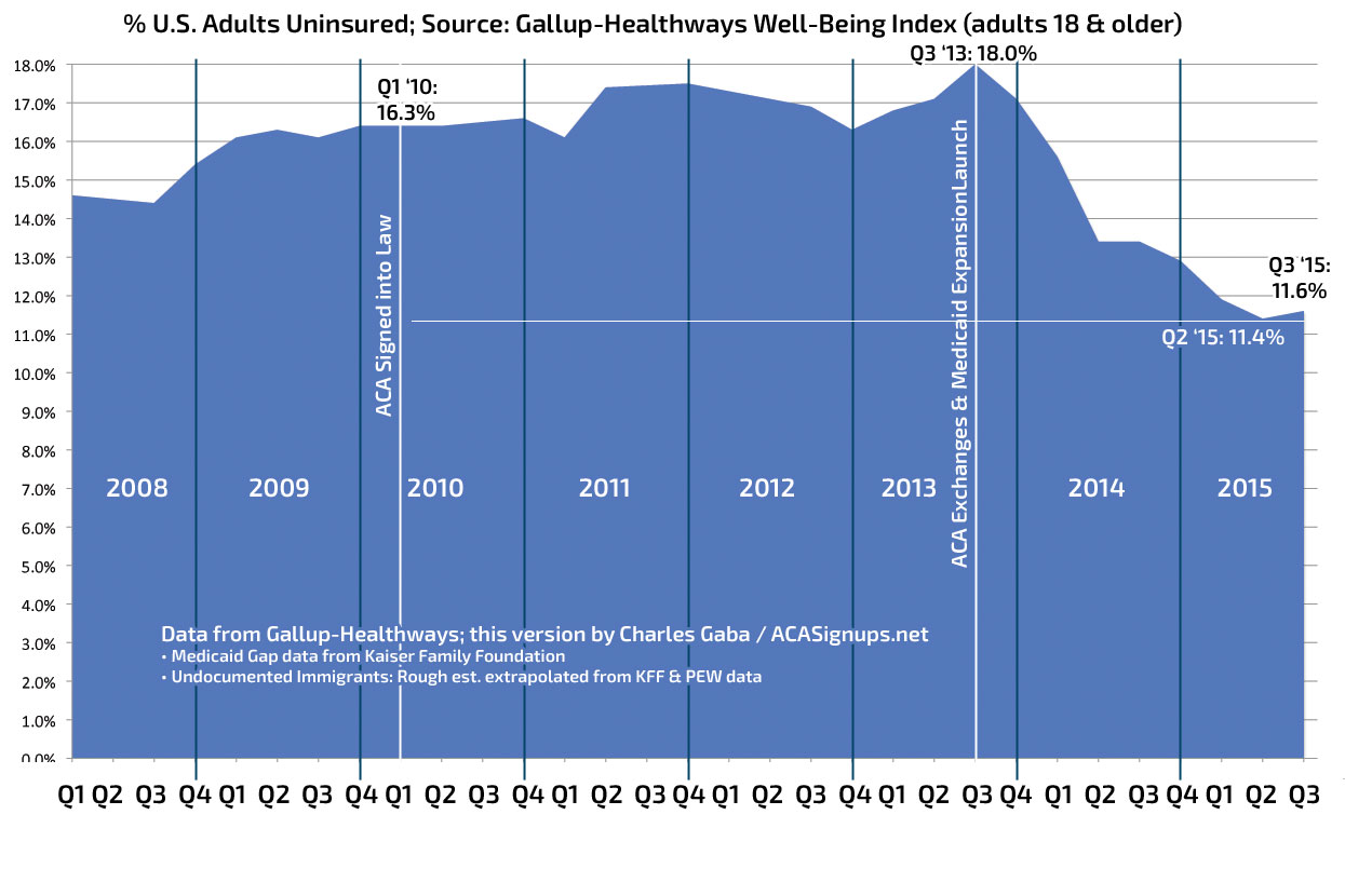 Aside from that, the other interesting tidbit from Young's piece is that apparently I missed the release of Gallup's 2015 3rd Quarter Uninsured Rate survey last week. This is the first quarter since the ACA Exchanges and Medicaid Expansion launched 2 years ago that Gallup has found the uninsured rate to increase (if only slightly), from 11.4% to 11.6%. However, even this isn't too unexpected: Last year, the rate held steady at 13.4% for the 2nd and 3rd quarters, since things are pretty stable during the off-season. This year, with Medicaid expansion pertty much tapped out, the uninsured rate was almost certain to remain flat at best between Q2 and Q3; it inching back up could simply be noise in the survey's margin of error. It should be back on the decline again starting soon, as 2016 Open Enrollment ramps up.