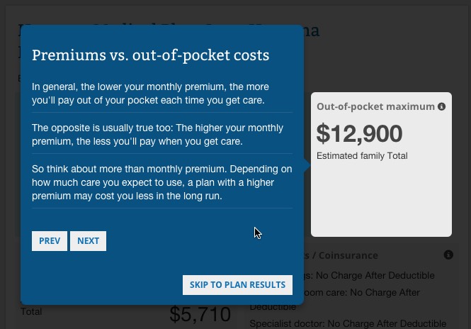 ...where they've added 4 new "Help Guides"...screen overlays to explain what the hell all of this stuff means (Copayments, Deductibles, Metal Levels and Out of Pocket vs. Premiums, as well as the Plan Filtering tool on the left sidebar):