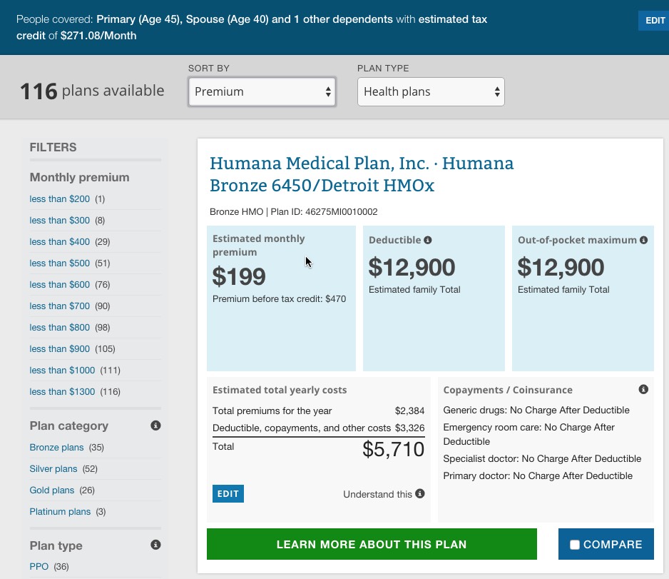 The way it works is pretty clever (and presumably modelled after similar tools on Covered California and a couple of other State-Based Exchanges. You choose from "Low", "Medium" or "High" expected medical needs for the upcoming year for each person in the household.
