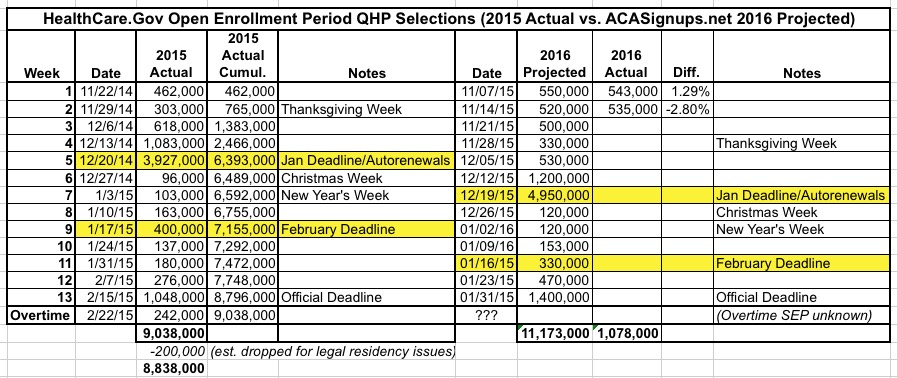 In any event, here's my official week-by-week projections for HealthCare.Gov only for the 2016 Open Enrollment period. Note that I will modify these as appropriate throughout the process, but these are my initial estimates. I've also included the 2015 Open Enrollment period for comparison: