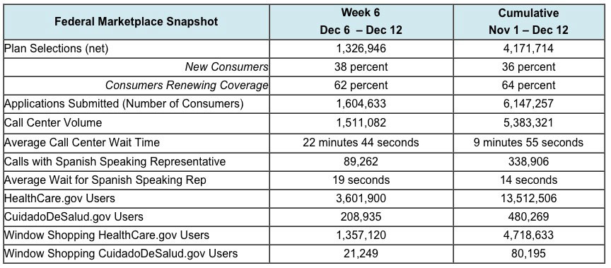 More than 1.3 million consumers signed-up for health coverage through the HealthCare.gov platform between December 6 and December 12, the last full week before the deadline for January 1 coverage, bringing the total number of plan selections made since Open Enrollment began on November 1 to 4.17 million consumers. Approximately 500,000 were new consumers, for a cumulative total of about 1.5 million new consumers since the beginning of Open Enrollment.
