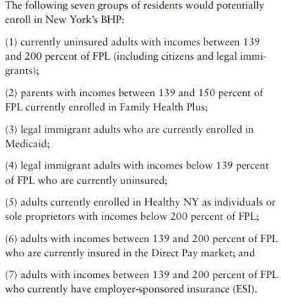 - All of this is moot anyway, because as Louise Norris points out, the official NY State of Health details specifically states that BHP enrollees must be 19-64 (no kids at all), and can't include pregnant women (since they qualify for Medicaid).