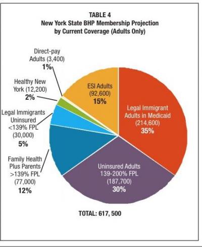 UPDATE x2: OK, Andrew Sprung has provided a much more recent and specific estimate: A 2012 study by the NYS Health Foundation which specifically estimates the total potential BHP enrollment (including documented immigrants, etc) at just 617,500 people...which is exactly what I was figuring (see page 2 and especially the pie chart on page 8):