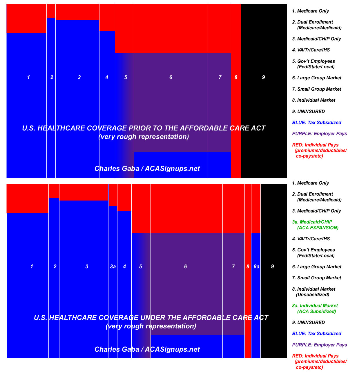 Even here, I've drastically oversimplified the situation. Each of the columns below--both pre- and post-ACA--are further stratified into dozens or hundreds of different smaller programs, companies, risk pools and/or payment mechanisms. For instance, Medicare and Medicaid are mostly paid for by taxes...but those taxes are still in turn paid, in large part, to private insurance companies who manage the programs. Meanwhile, the federal government may pay 50% of one state's Medicaid program and 70% in another. Each of those states might have different thresholds for Medicaid eligibility depending on whether a given resident is a pregnant woman, a newborn, an adolescent or a single parent, depending on their income level. There are thousands of private insurance companies operating both the large group/small group markets (employer-based) as well as the individual (non-group) market, and so on. Remember that each state has their own rules/regulations/laws for many of these things as well, so you have to multiply the charts below by at least 50x to begin to get the full picture.