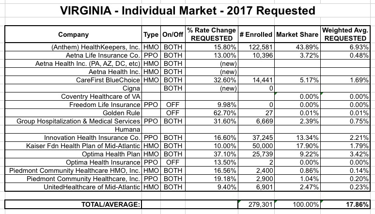 In any event, Humana and Coventry appear to be being dropped in Virginia's individual market, so without knowing how much their enrollees were paying (or where they'll move to next year), it's impossible to factor them into a weighted average. So, until further notice, it looks like I had it right in the first place: Virginia's requested average 2017 rate hike is around 17.9%.