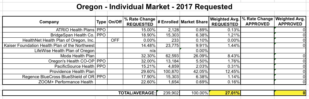 Some states make it next to impossible to track down this info. Others hand it to you on a silver plate. And then there are states like Oregon, who provide the average rate hike requests in a simple, easy format, but don't necessarily include the market share of those companies, making it difficult to compile a weighted average: