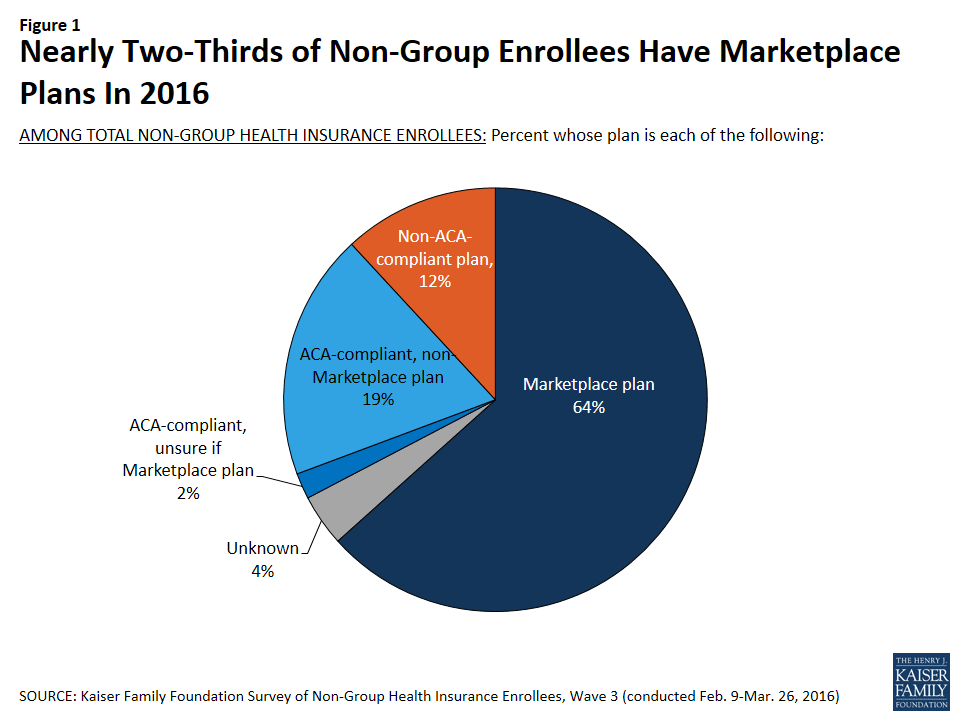 Looking at the non-group market as a whole, nearly two-thirds of enrollees (64 percent) report being in a Marketplace plan.3 This is similar to the share who had Marketplace plans in 2015 (59 percent) and an increase from 2014 (48 percent). Currently, about one in five enrollees (19 percent) report being in an ACA-compliant, non-Marketplace plan purchased from a broker or insurance company, and 12 percent report having pre-ACA, non-compliant plans.4