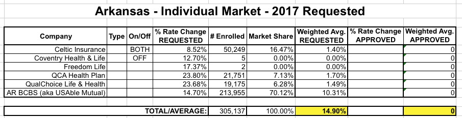 Arkansas was a little weird...while the rate filings for 5 carriers are listed over at RateReview.HealthCare.Gov, the carrier with the largest individual market share in the state, BCBS (aka "USAble Mutual") is nowhere to be seen (there's a sm. group listing for them, but not individual). However, when I went directly to the AR SERFF database, there they were--and it's listed specifically as "2017 Individual QHP Rates", so there's no question here about whether they plan on offering ACA-compliant policies in 2017.