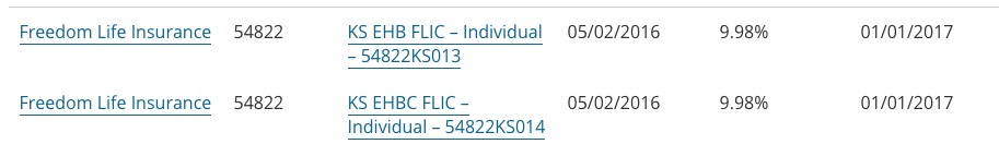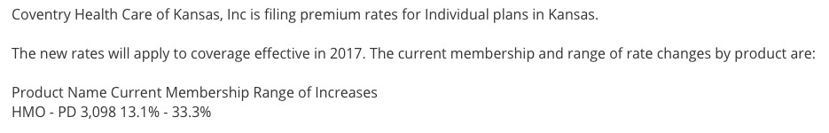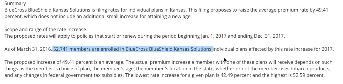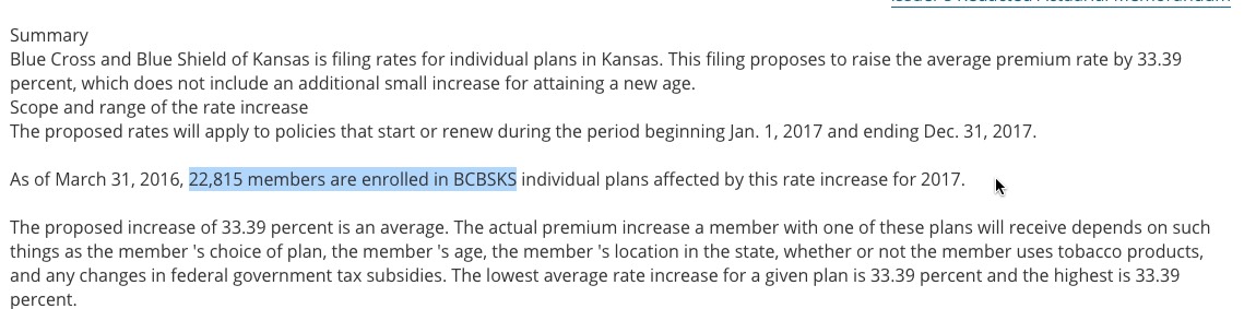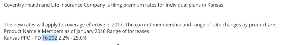 The good news about Kansas is that 5 of the 6 carriers which have submitted 2017 individual market rate filings included their current enrollment totals in a clear, easy to see format...and the 6th one is (once again) "Freedom Life" which, judging by the dozen other states they've popped up in, almost certainly has only 1 or 2 enrollees (or none at all) anyway.