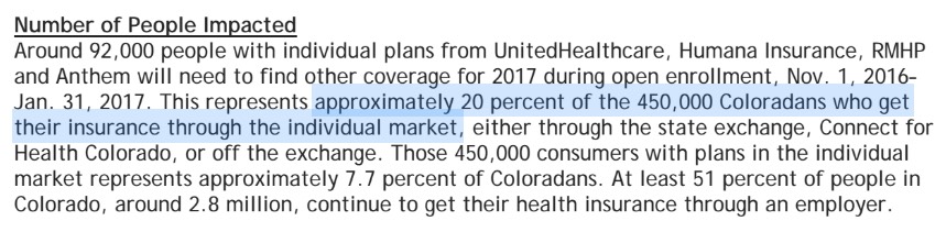 ...Approximately 450,000 Coloradans get their health insurance through the individual market. More than half – or 2.8 million -- continue to get insurance through an employer.