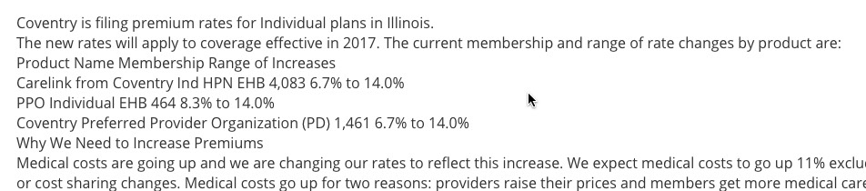 As I noted Monday morning, I believe that August 1st was the deadline for every state to submit their 2017 rate filings, meaning that the 14 states missing from my Requested Rate Hike Project are finally available to be plugged into the spreadsheet. I'll also be going back through the other states I've been tracking since as early as April to see which ones require updates due to carriers dropping out, joining in or resubmitting their rate requests.