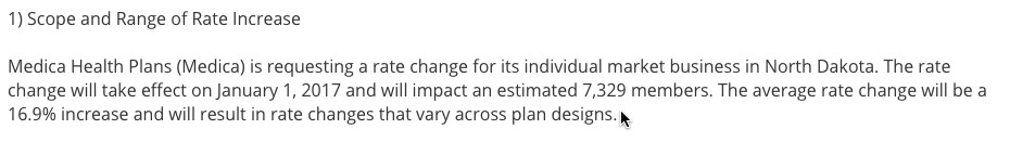 All of the above numbers are important when attempting to estimate the weighted average rate hikes requested by ND carriers, because of the 3 operating on the individual market (BCBS, Medica and Sanford), only one of them, Medica, has provided their actual 2016 enrollment tally (7,329).
