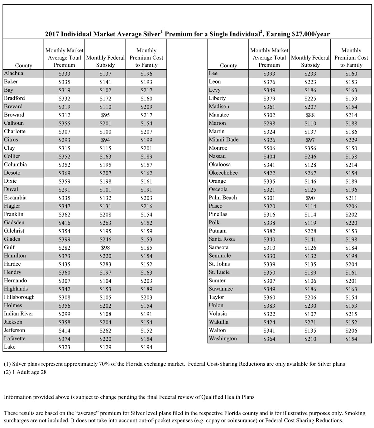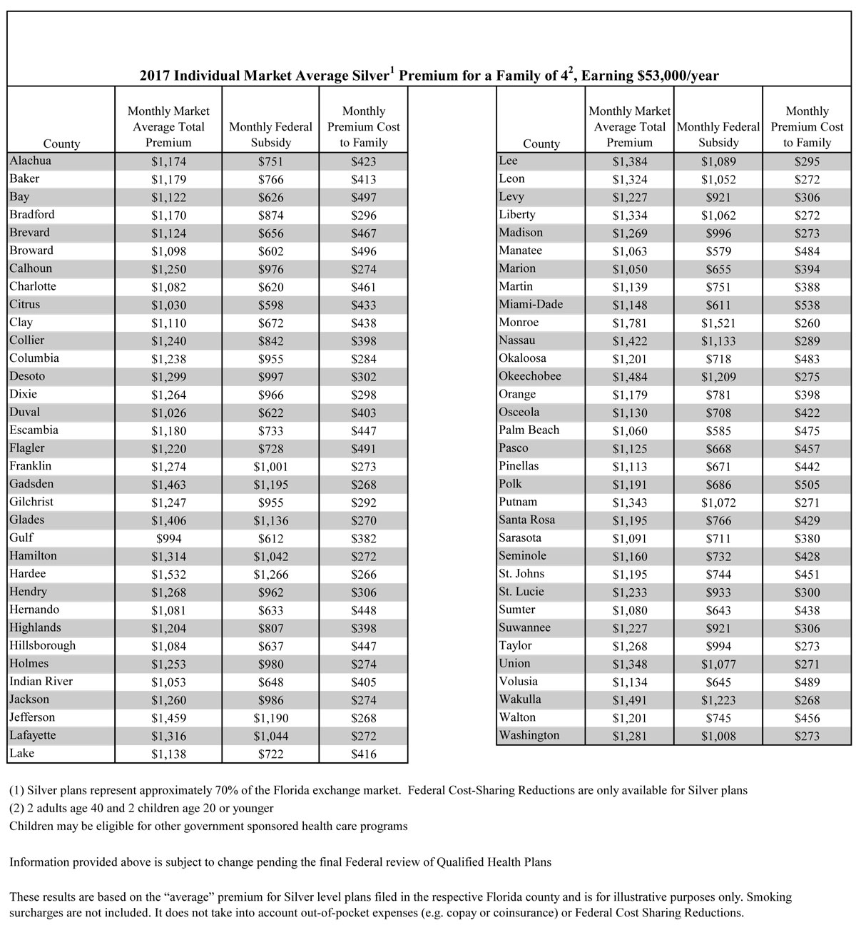 In addition, two tables showing the average estimated 2016 vs. 2017 health insurance premiums by Florida county in the individual market are being provided for a family of four with an income of $53,000* (see attached) and a single individual with an income of $27,000* (see attached). This analysis does account for federal premium tax credits (subsidies) to illustrate overall premium costs and both examples use the selection of a Silver plan. The Silver plan is the most frequently selected plan on the Exchange because it is the only plan where qualified consumers can take advantage of cost sharing assistance, while federal premium tax credits are available to qualified consumers at all plan levels through the Exchange.