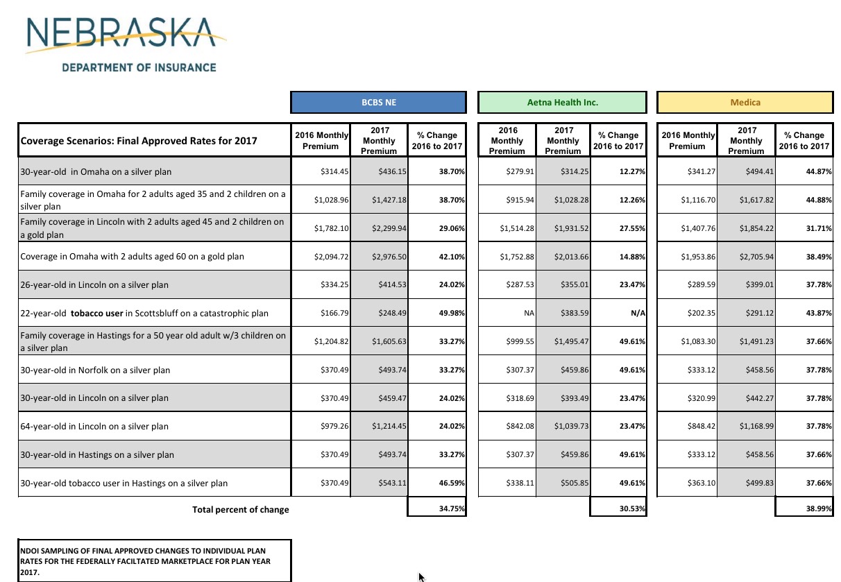 The figures compared 2016 and 2017 rates for Blue Cross Blue Shield of Nebraska, Aetna Health Inc. and Medica, the three companies that will offer policies to Nebraskans on the exchange when open enrollment starts Nov. 1.