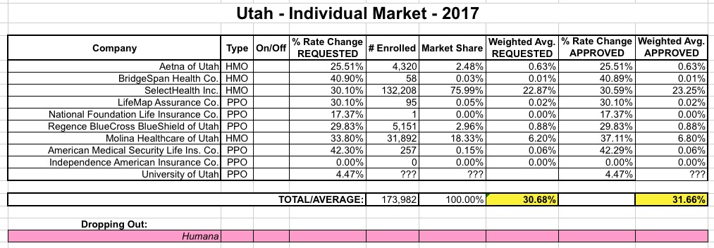 Utah: Approved *unsubsidized* 2017 avg. indy mkt rate hikes: 31.7%
