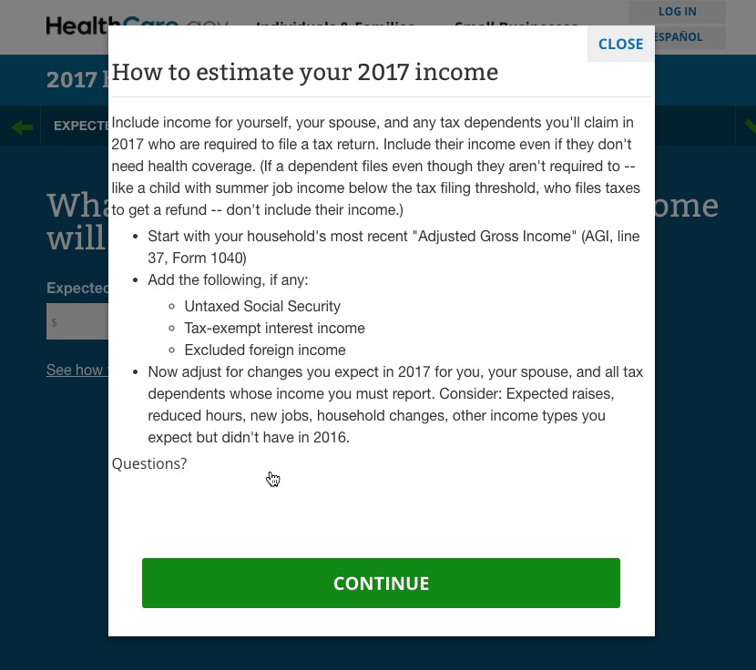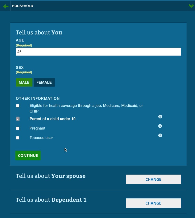 So far, I've been plugging in accurate data (my correct zip code and age). For the rest, I'm using test data. For instance, if your household income is under 250% of the Federal Poverty Line ($50,400 for a family of 3), in addition to the Advanced Premium Tax Credits (APTC), you also qualify for Cost Sharing Reduction (CSR) assistance...