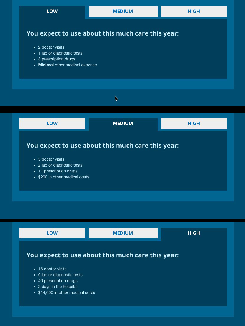Also like last year, HC.gov has a handy "total cost estimator" which gives an idea of  your out of pocket costs depending on low, medium and high levels of use throughout the year...but they've made it more obvious how this works: