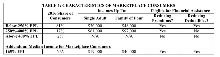 The table below shows the distribution of Marketplace consumers in 2016. The typical Marketplace consumer has an income of 165 percent of the federal poverty level (FPL): about $40,000 for a family of four, and $19,000 for a single adult. Consumers at these income levels qualify for financial assistance that reduces premiums as well as deductibles and other cost sharing.