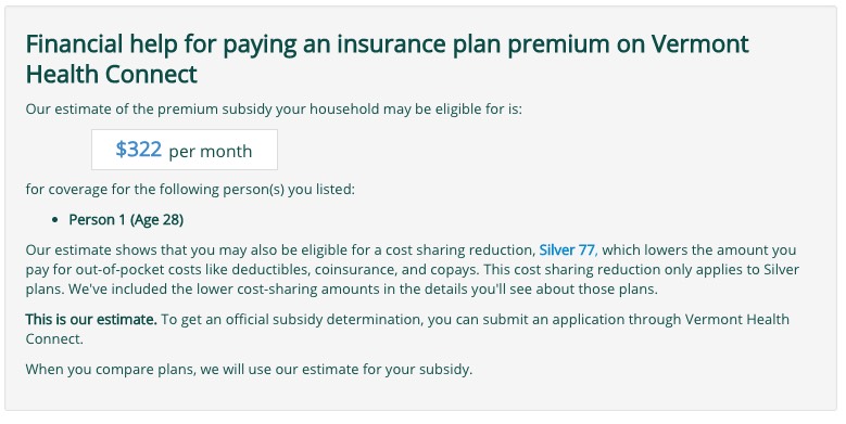 (sigh) Aside from Ms. Tyce-Royea's cringe-inducing lack of understanding about how insurance works, out of curiosity, I decided to take a look at her situation by plugging her info into the Vermont Health Connect ACA exchange website.