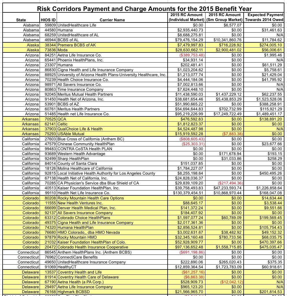 A table follows, listing every carrier across the country which owes money to or is owed money from the Risk Corridor program for 2015, as well as how much 2015 funding will be paid out to them to cover what's still owed for 2014. It's a long list, and some of the numbers are pretty big.