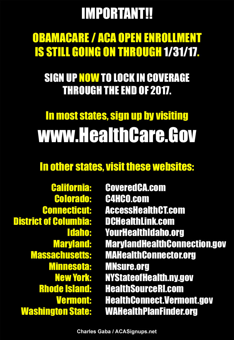 This may seem a little silly, but given the upcoming Open Enrollment deadline, the did-they-or-didn't-they confusion regarding the Trump administration's attempt to pull the final TV commercial/social media/phone/email notifications and the general insanity going on right now, I figured it might be helpful to provide direct links to the various ACA (Obamacare) websites for people to actually sign up for 2017 coverage.